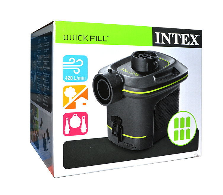 The Intex Quick-Fill™ Battery Air Pump is perfect for using indoors or outdoors, this pump operates on 6 C batteries. Simply plug in the batteries, turn the pump on and begin inflating or deflating in seconds. The included adapter with 3 nozzles makes this pump compatible with many different inflatable products while the 420 L/min max air flow gets the job done quickly. Never get caught trying to find a power outlet or inflate manually, get the Intex Quick-Fill™ Battery Pump and get the job done quick!