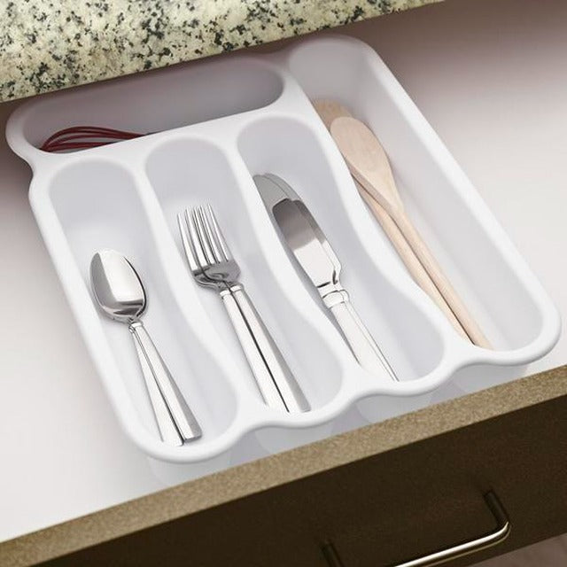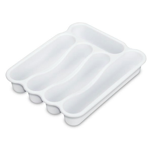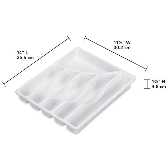 Expertly declutter your drawers with the Sterilite 5 Compartment Cutlery Tray. Its 5 compartments are specifically designed to store and sort your kitchen utensils for easy access. - Keep everything in place with the tray's soft edges and sleek, textured surface, perfect for cleaning. Its versatile design also makes it great for organizing school supplies. - With overall dimensions of 13 1/2" L x 11" W x 2 5/8" H, this tray is the perfect solution for all your silverware storage needs. Improve the organization in your drawers today.