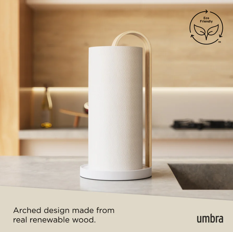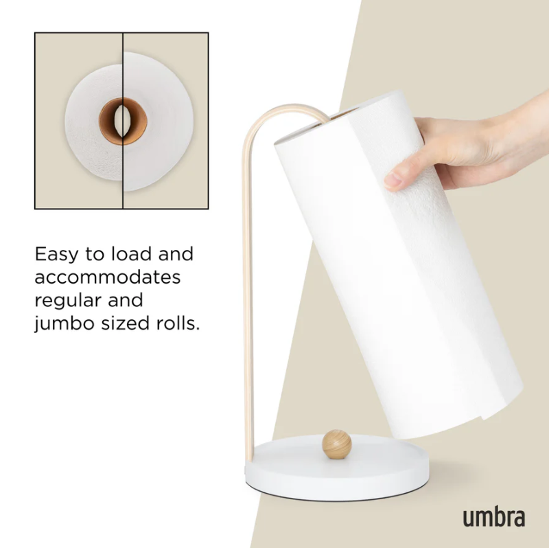 Elevate your kitchen with the UMBRA Bellwood Paper Towel Holder! Featuring a real bentwood accent and sturdy metal base, this holder is both attractive and functional. The weighted base offers stability and protection for your countertop, while the easy-to-use design allows for quick reloading. Complete your kitchen with the matching Bellwood Collection and enjoy the satisfaction of an original design.